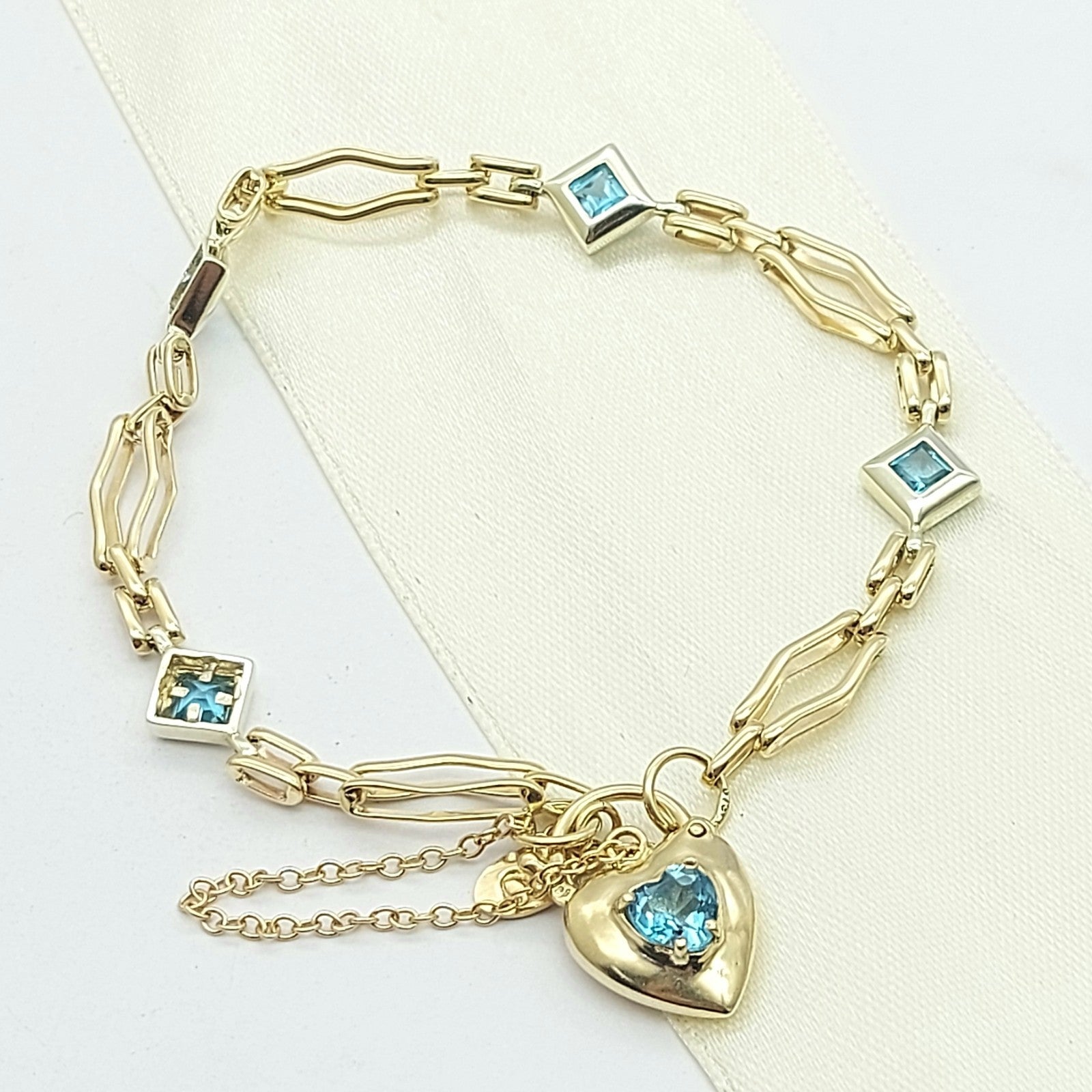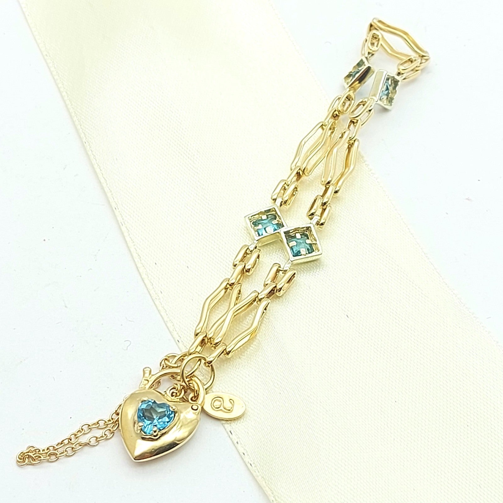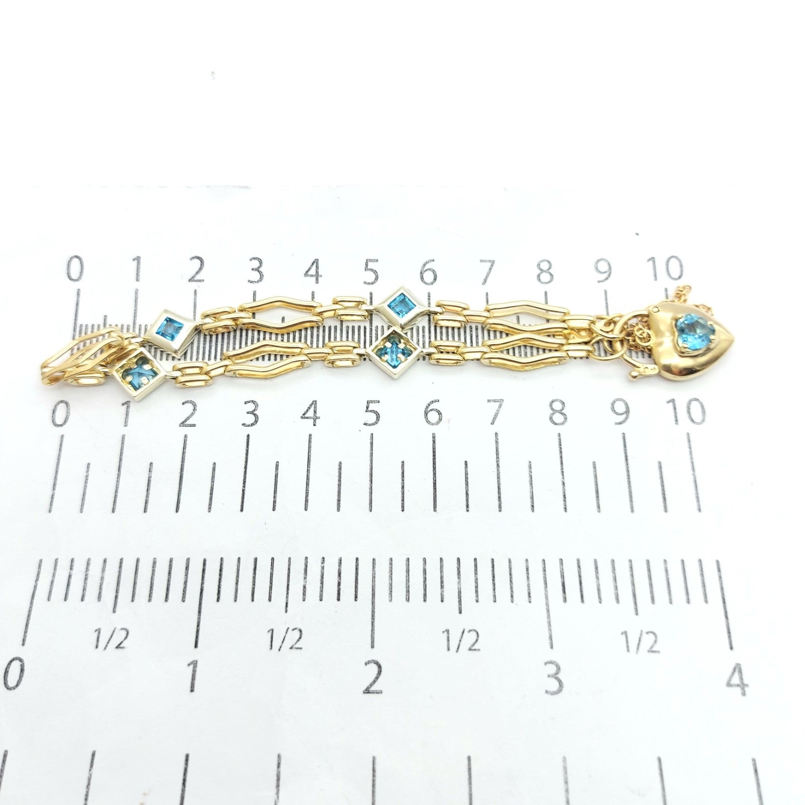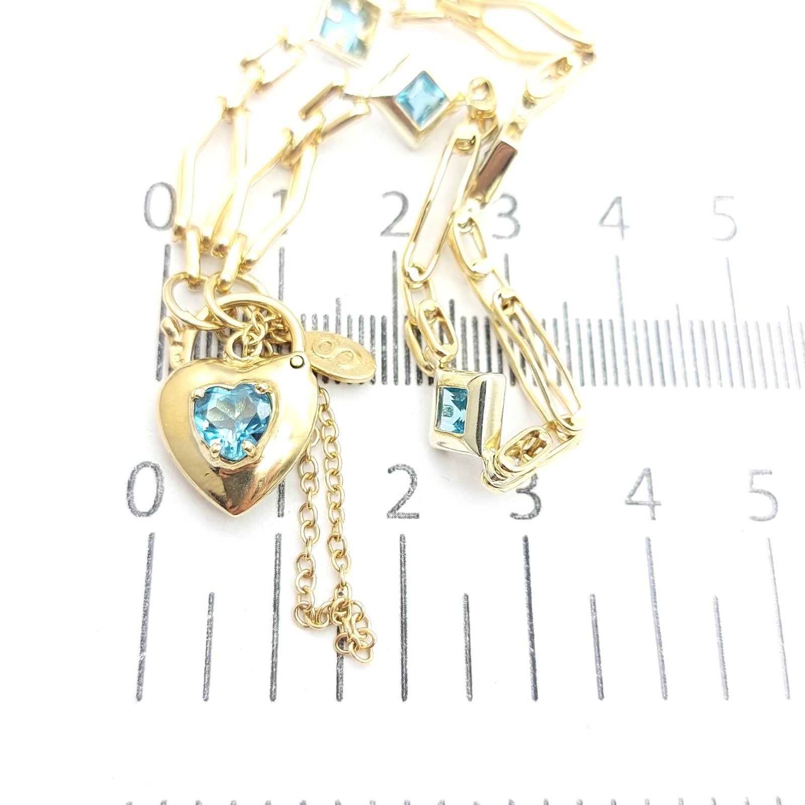 Ladies Yellow Gold 9ct (375,9K) Natural Blue Topaz Heart Padlock Square Gate Bracelet