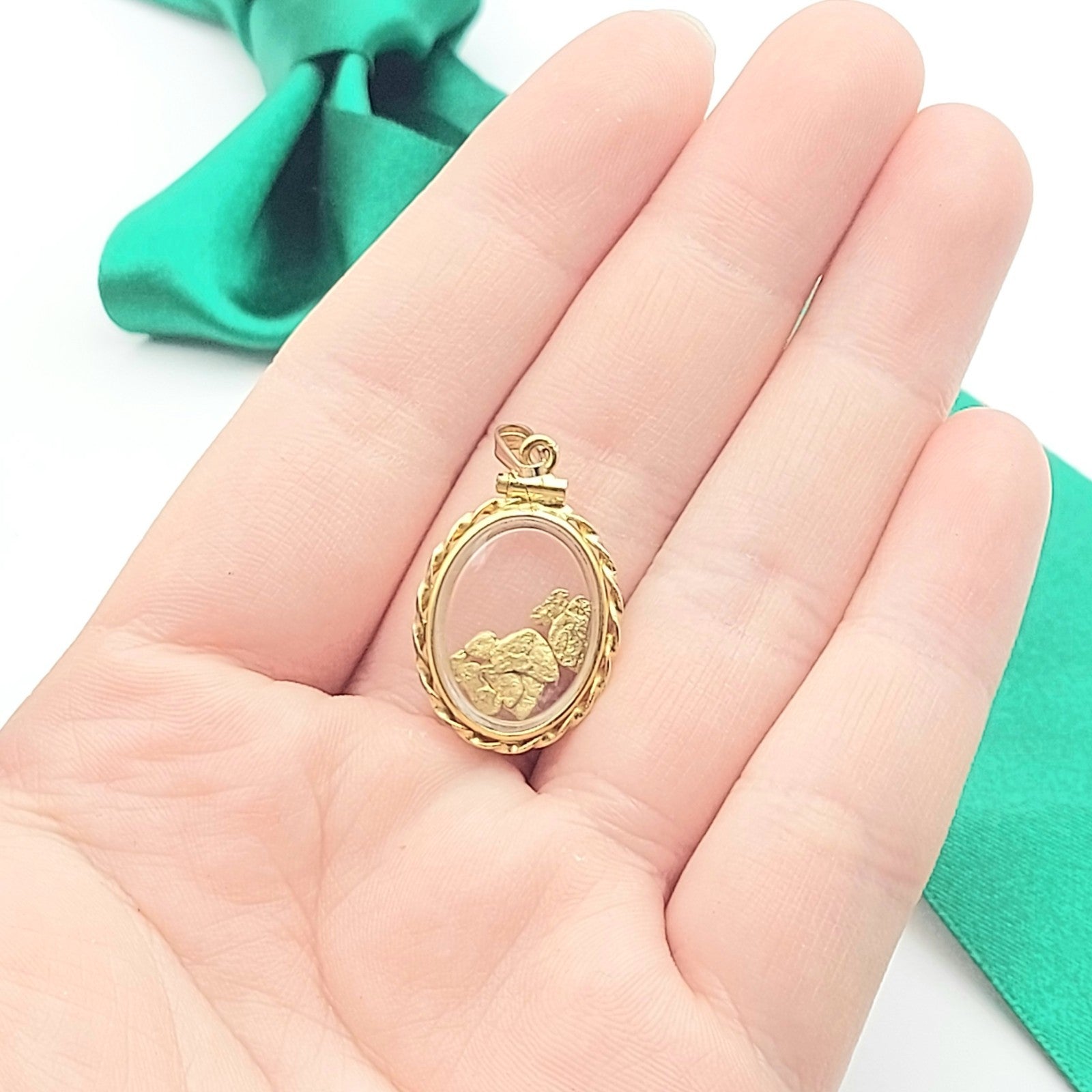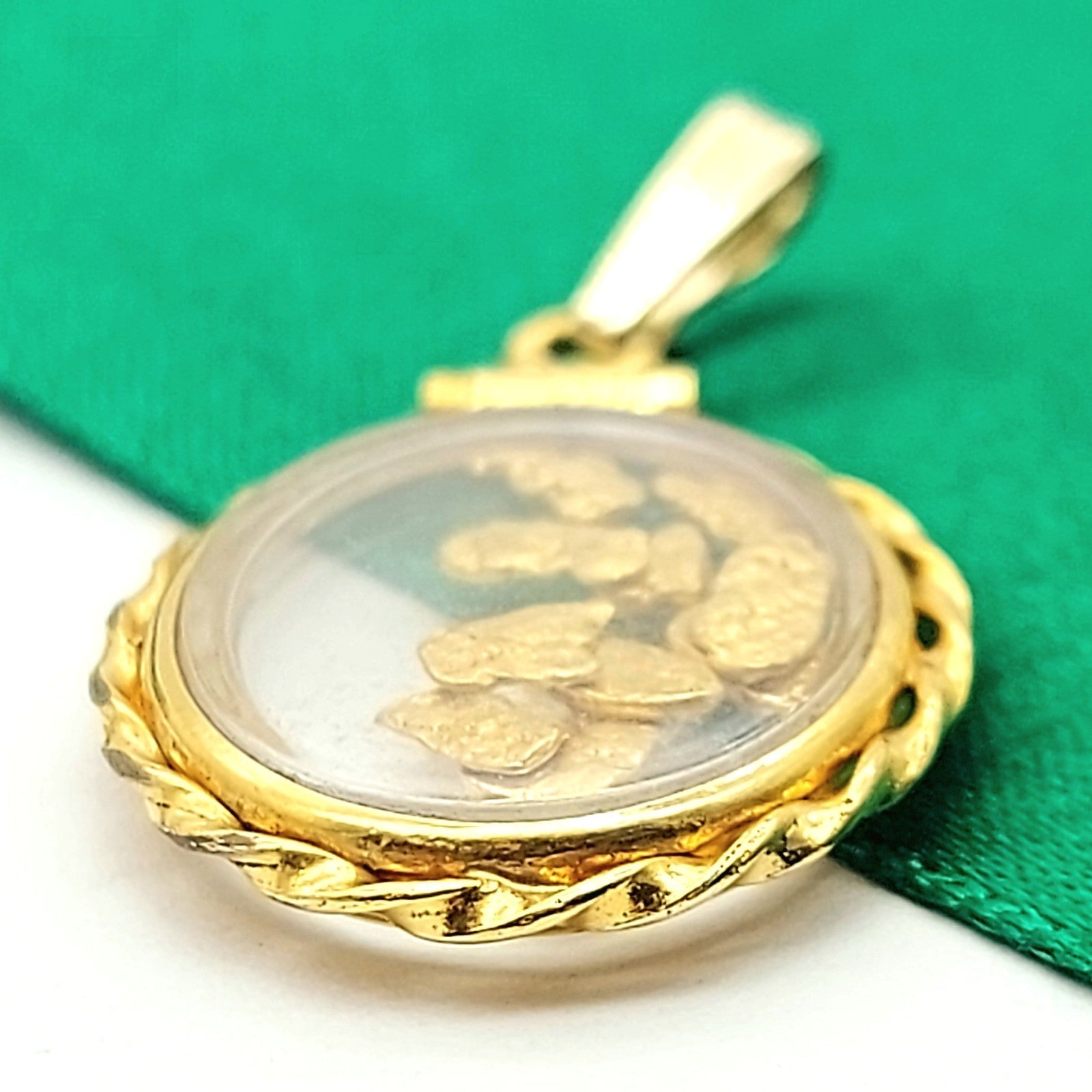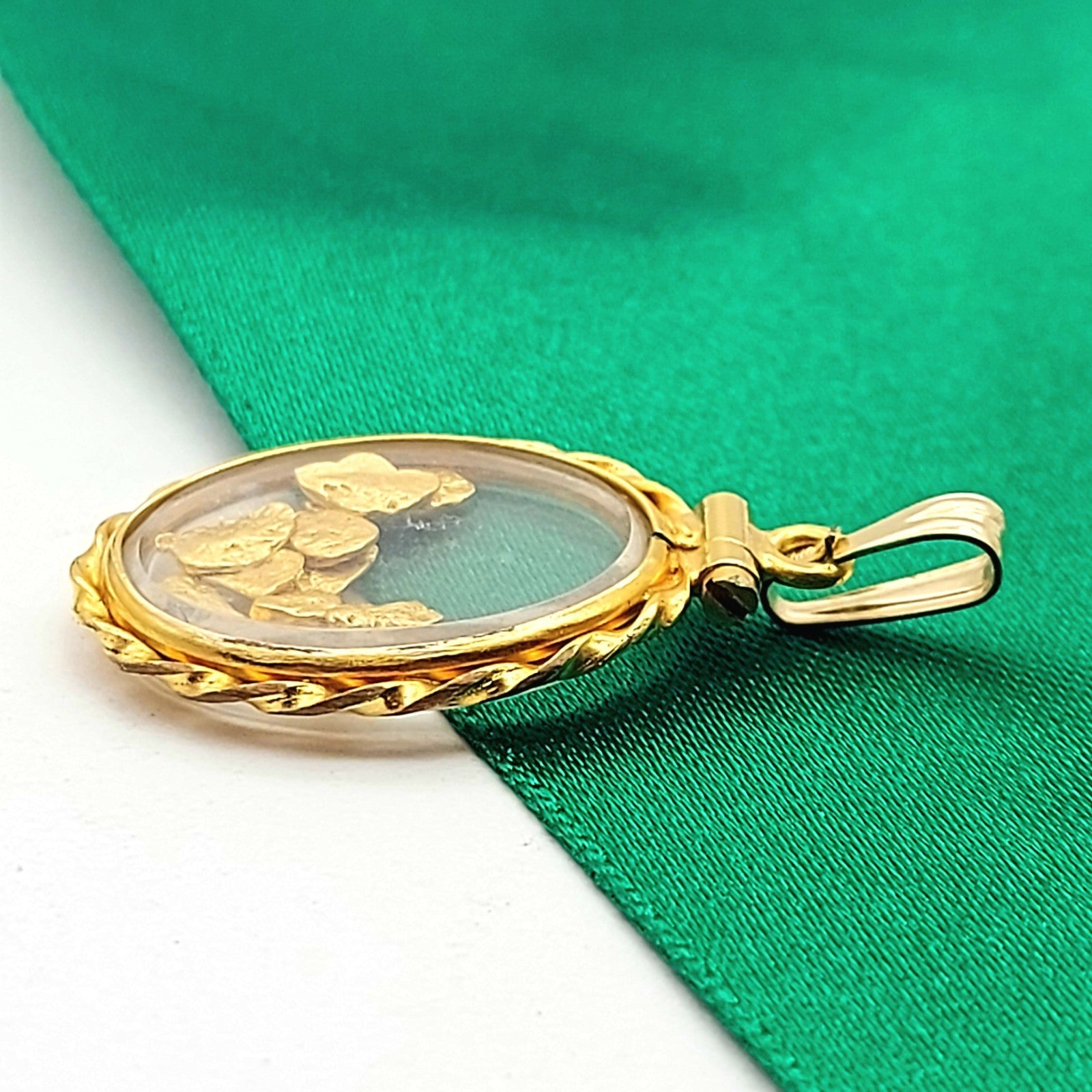 Welcome to the Gold and Diamond Exchange Store! - Sydney Based Store that has experience in the jewellery industry for over 30 years. - Specialising in: selling and buying jewellery, precious metals, coins, bullion, diamonds and watches. - Professionally assessed and tested using the most up to date equipment in our industry, including x-ray testing & diamond testers to ensure the quality and purity of our products. - Most of our items are brand new, from defunct jewellery stores. We offer wholesale and below pricing. Ladies Vintage Yellow Gold 9ct (375, 9K) Enclosed Nuggets (23ct) Oval Pendant This piece has been professionally polished and cleaned to look and function as new and is in an immaculate condition. A very rare and well-made good condition pendant. Jump ring is 9ct yellow gold the pendant is rolled 14k yellow gold- plated and not real gold- however nuggets tested as 23ct. Pendant for sale only, chain not included!