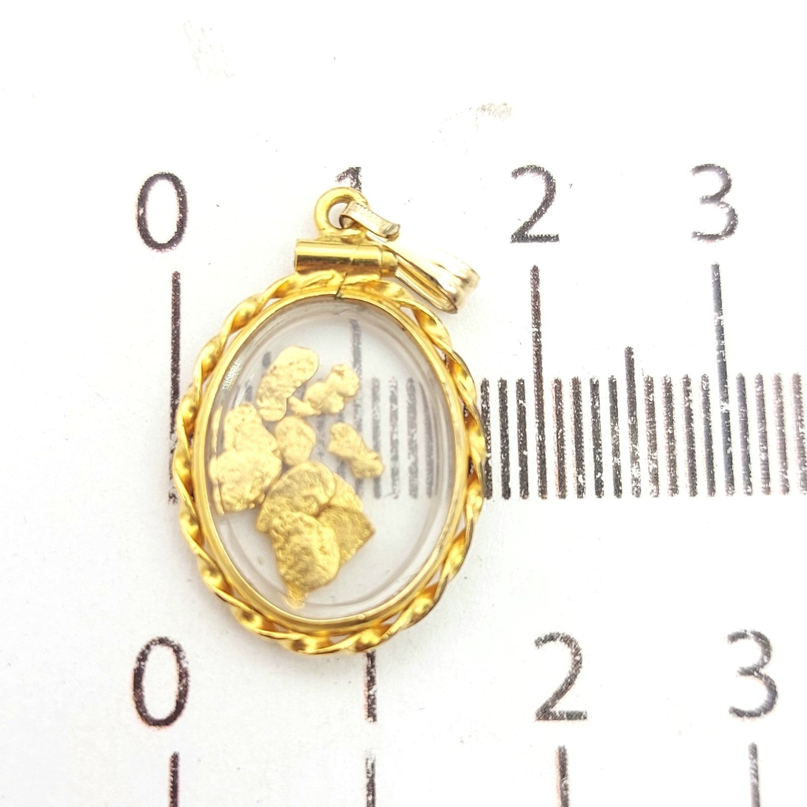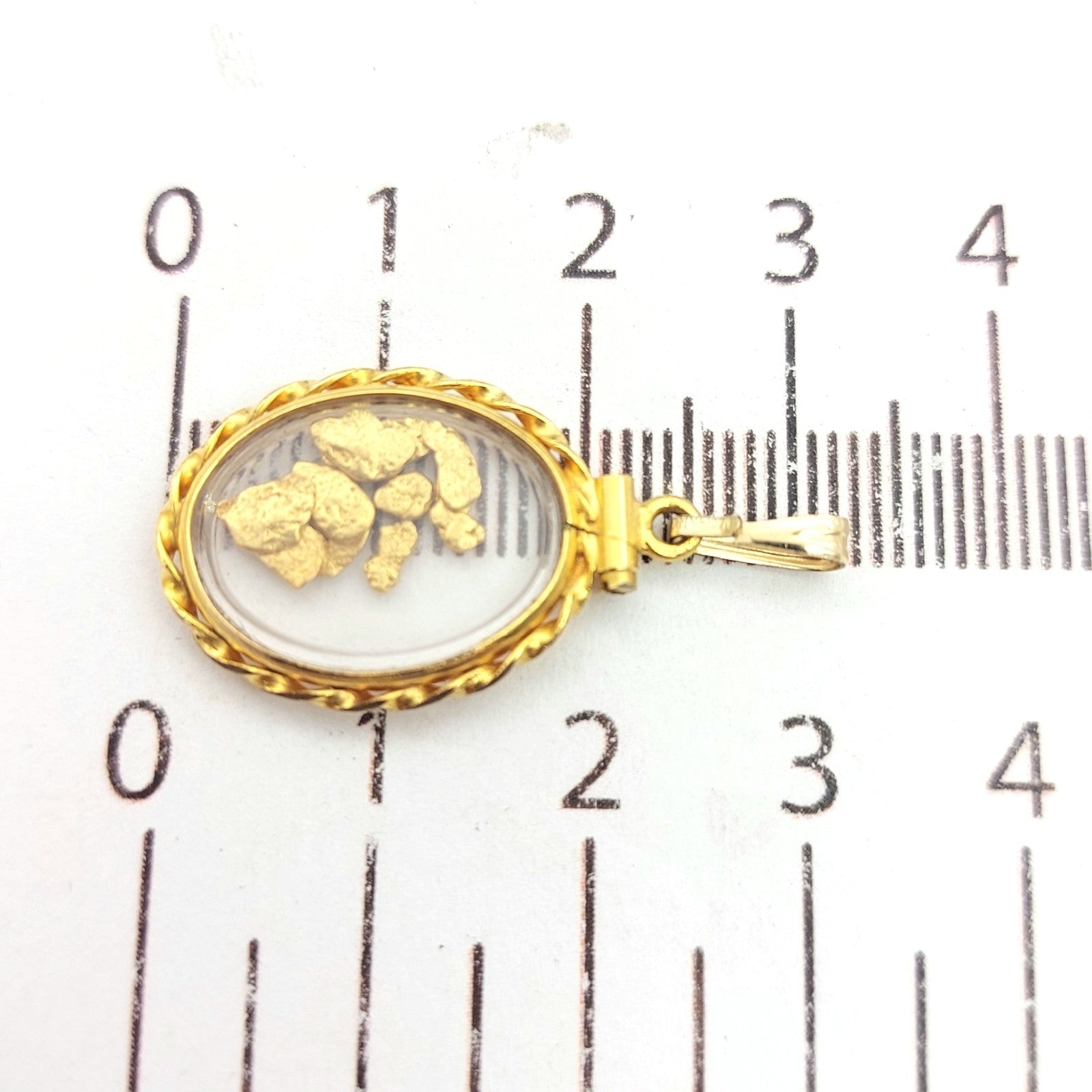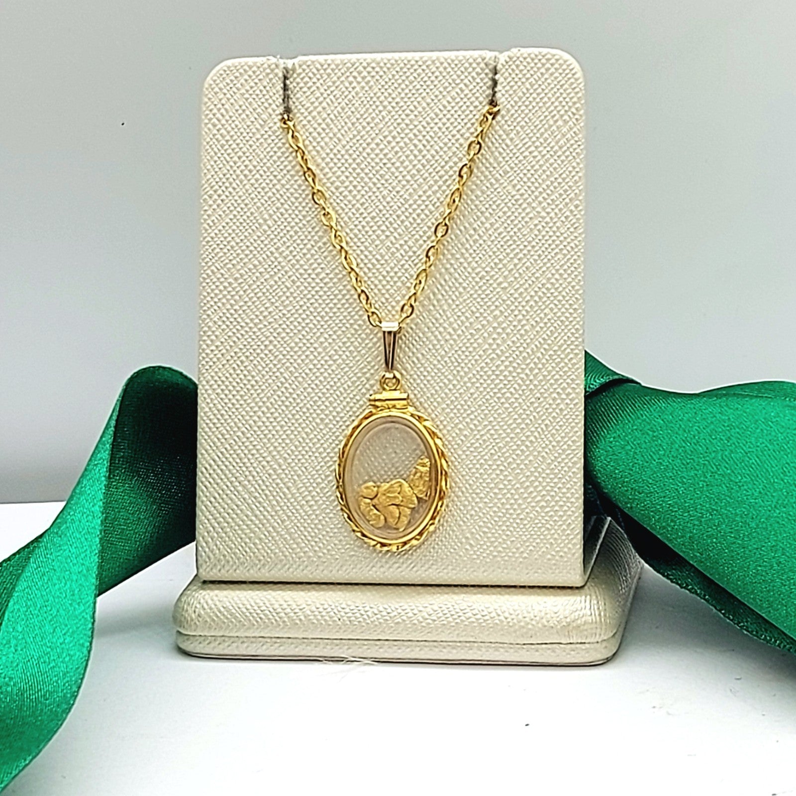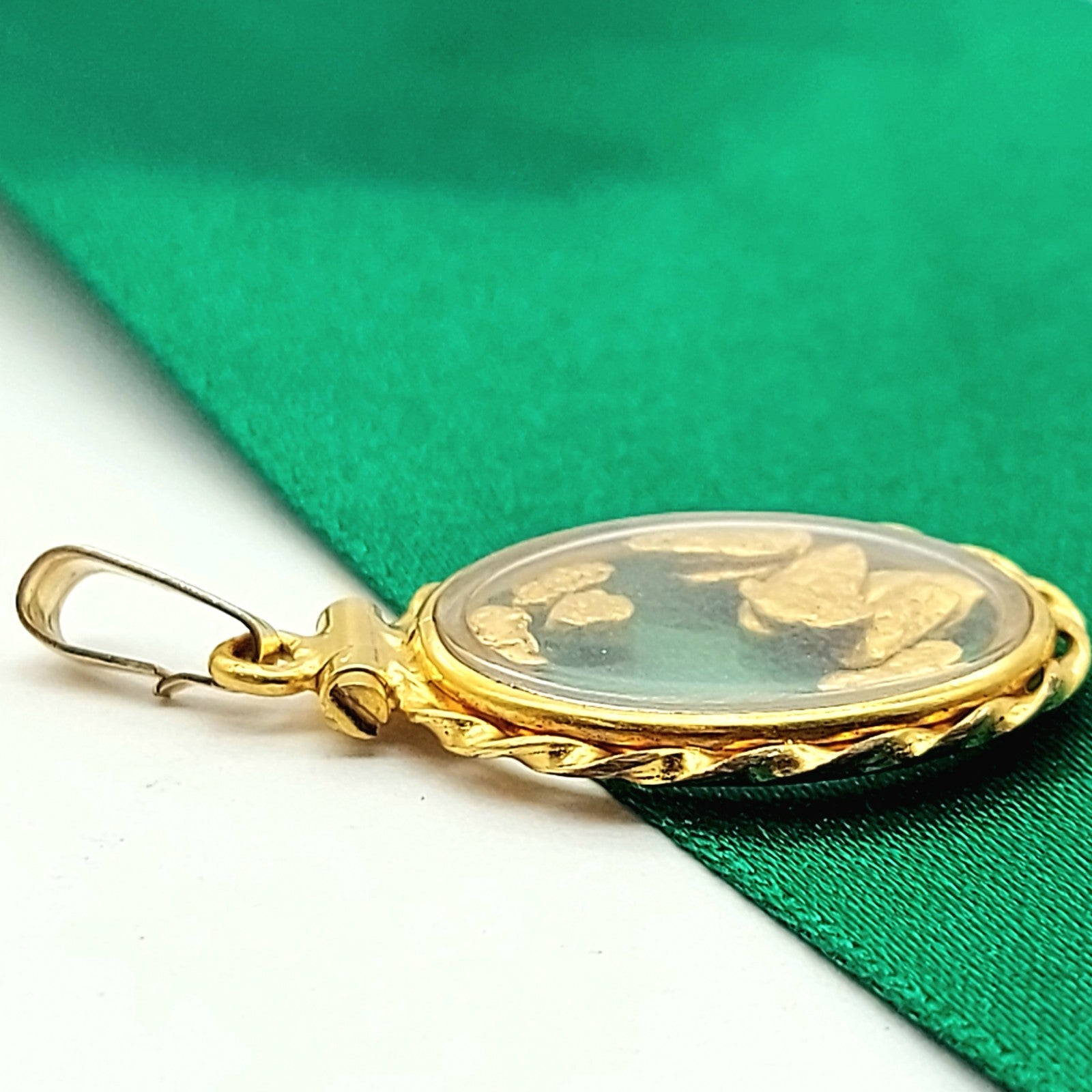 Welcome to the Gold and Diamond Exchange Store! - Sydney Based Store that has experience in the jewellery industry for over 30 years. - Specialising in: selling and buying jewellery, precious metals, coins, bullion, diamonds and watches. - Professionally assessed and tested using the most up to date equipment in our industry, including x-ray testing & diamond testers to ensure the quality and purity of our products. - Most of our items are brand new, from defunct jewellery stores. We offer wholesale and below pricing. Ladies Vintage Yellow Gold 9ct (375, 9K) Enclosed Nuggets (23ct) Oval Pendant This piece has been professionally polished and cleaned to look and function as new and is in an immaculate condition. A very rare and well-made good condition pendant. Jump ring is 9ct yellow gold the pendant is rolled 14k yellow gold- plated and not real gold- however nuggets tested as 23ct. Pendant for sale only, chain not included!