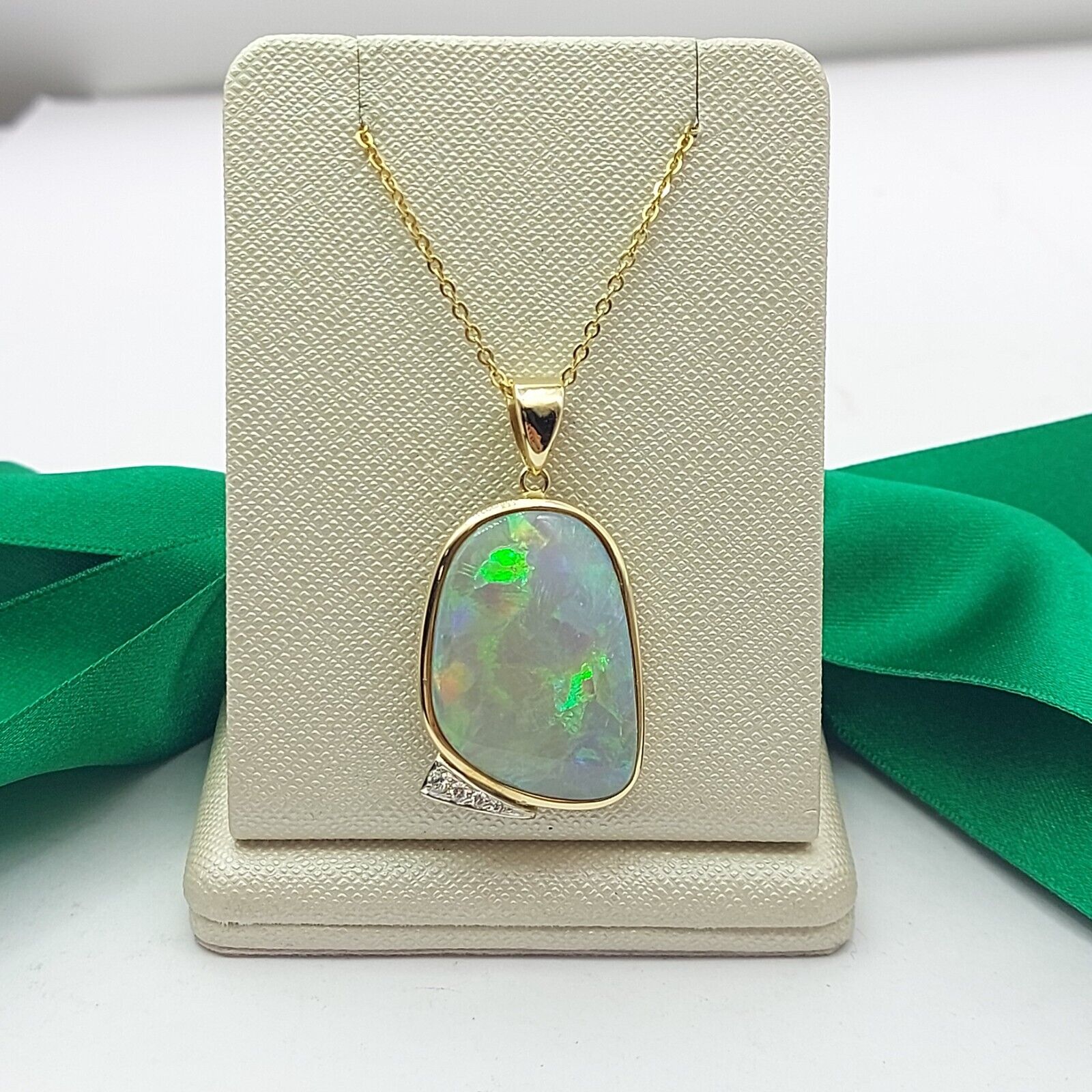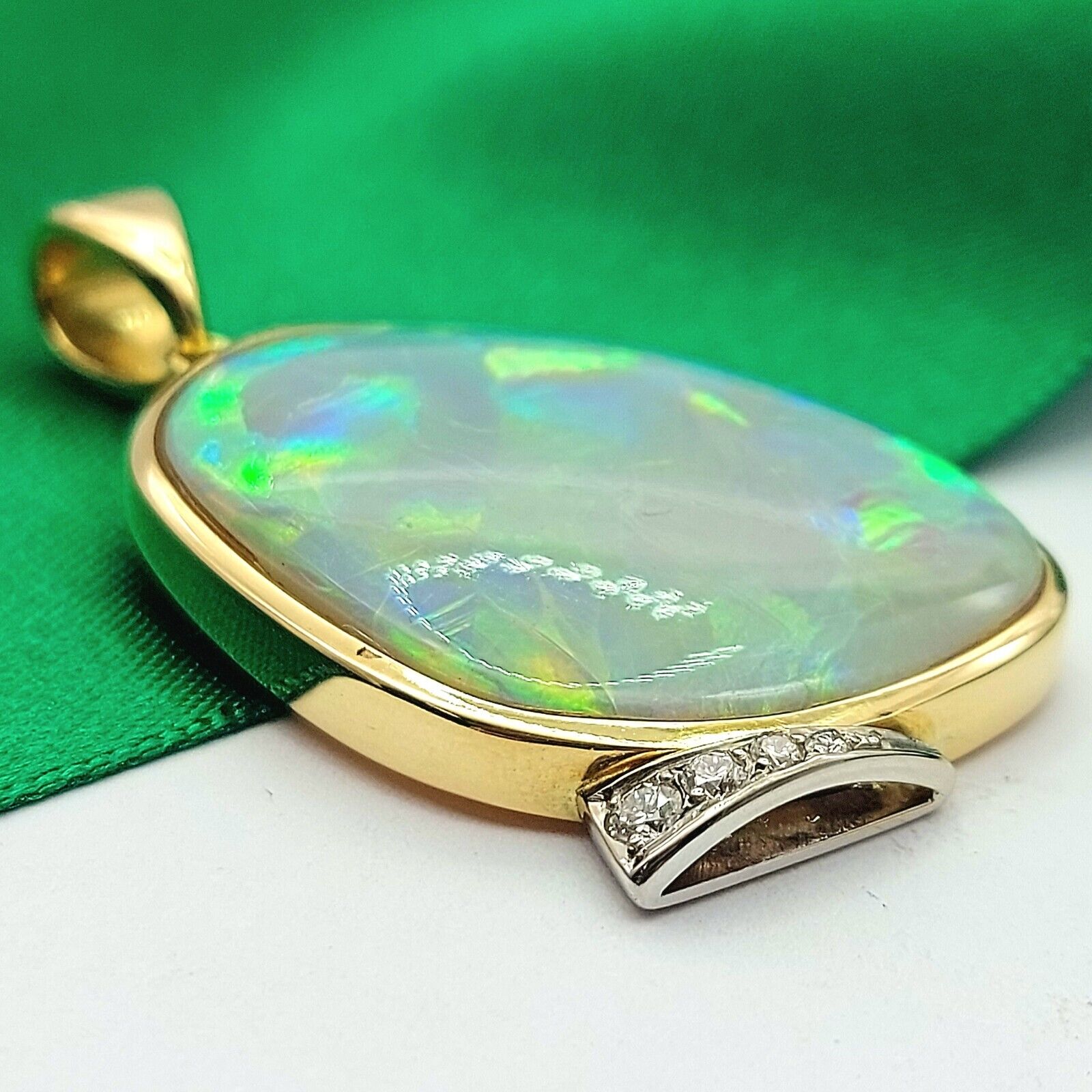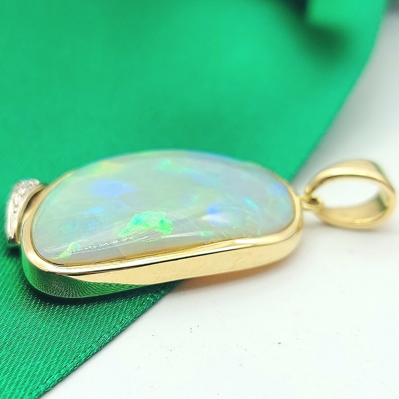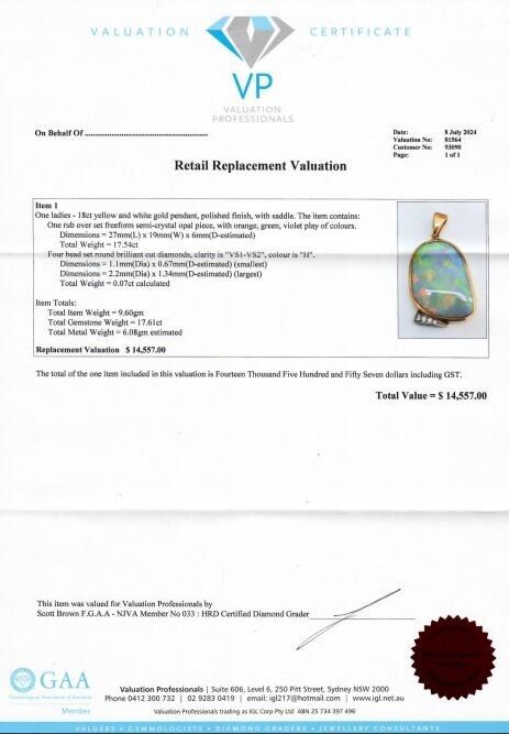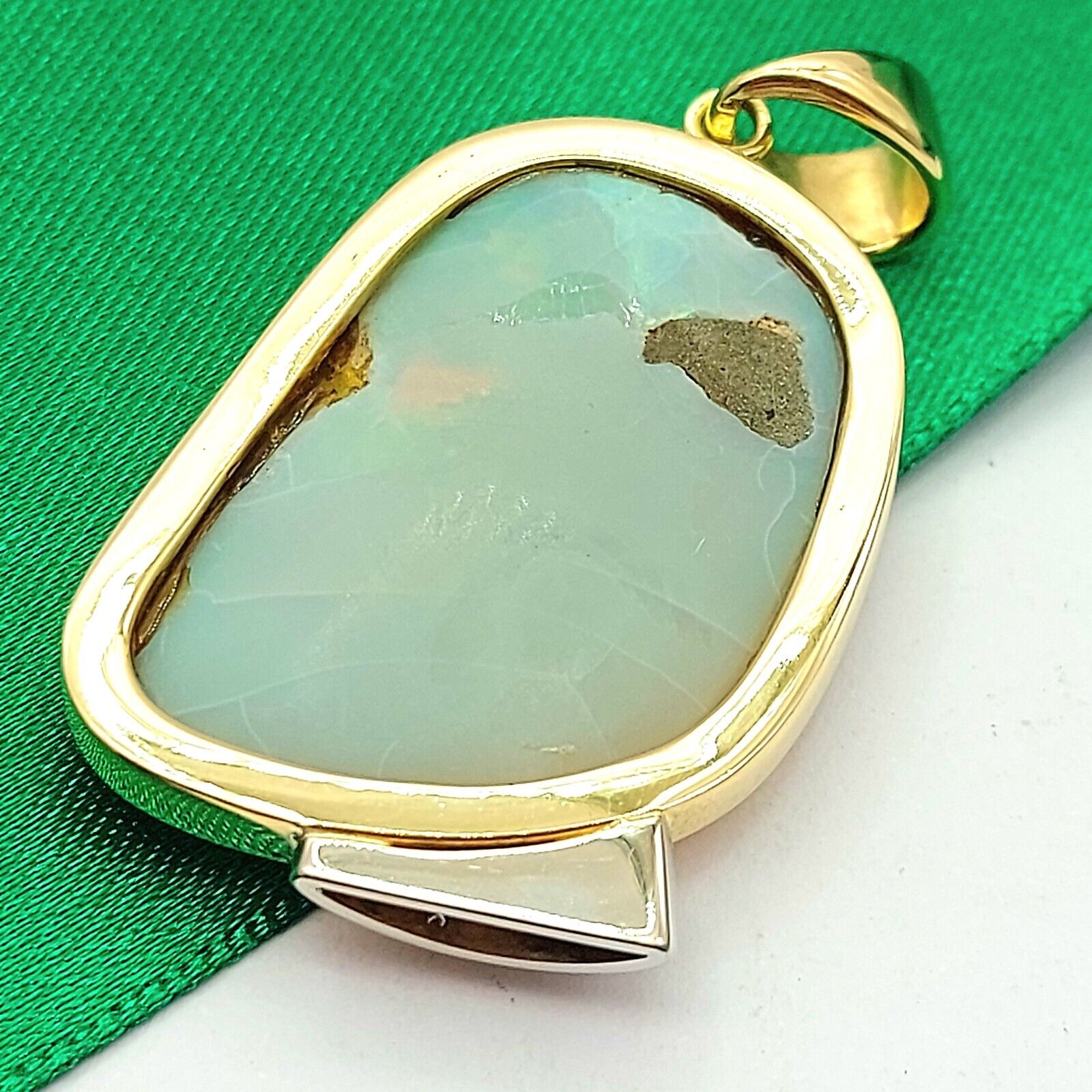 | Welcome to the Gold and Diamond Exchange Store! - Sydney Based Store that has experience in the jewellery industry for over 30 years. - Specialising in: selling and buying jewellery, precious metals, coins, bullion, diamonds and watches. - Professionally assessed and tested using the most up to date equipment in our industry, including x-ray testing & diamond testers to ensure the quality and purity of our products. - Most of our items are brand new, from defunct jewellery stores. We offer wholesale and below pricing. Ladies Yellow Gold 18ct (750,18K) High Quality Natural Opal Pendant W/ Val- 14k This piece has been professionally polished and cleaned to look and function as new and is in immaculate condition. A very rare and well-made good condition. This pendant is hallmarked '750' indicting the purity of the gold. Pendant for sale only, chain not included! *Includes Valuation Certificate*