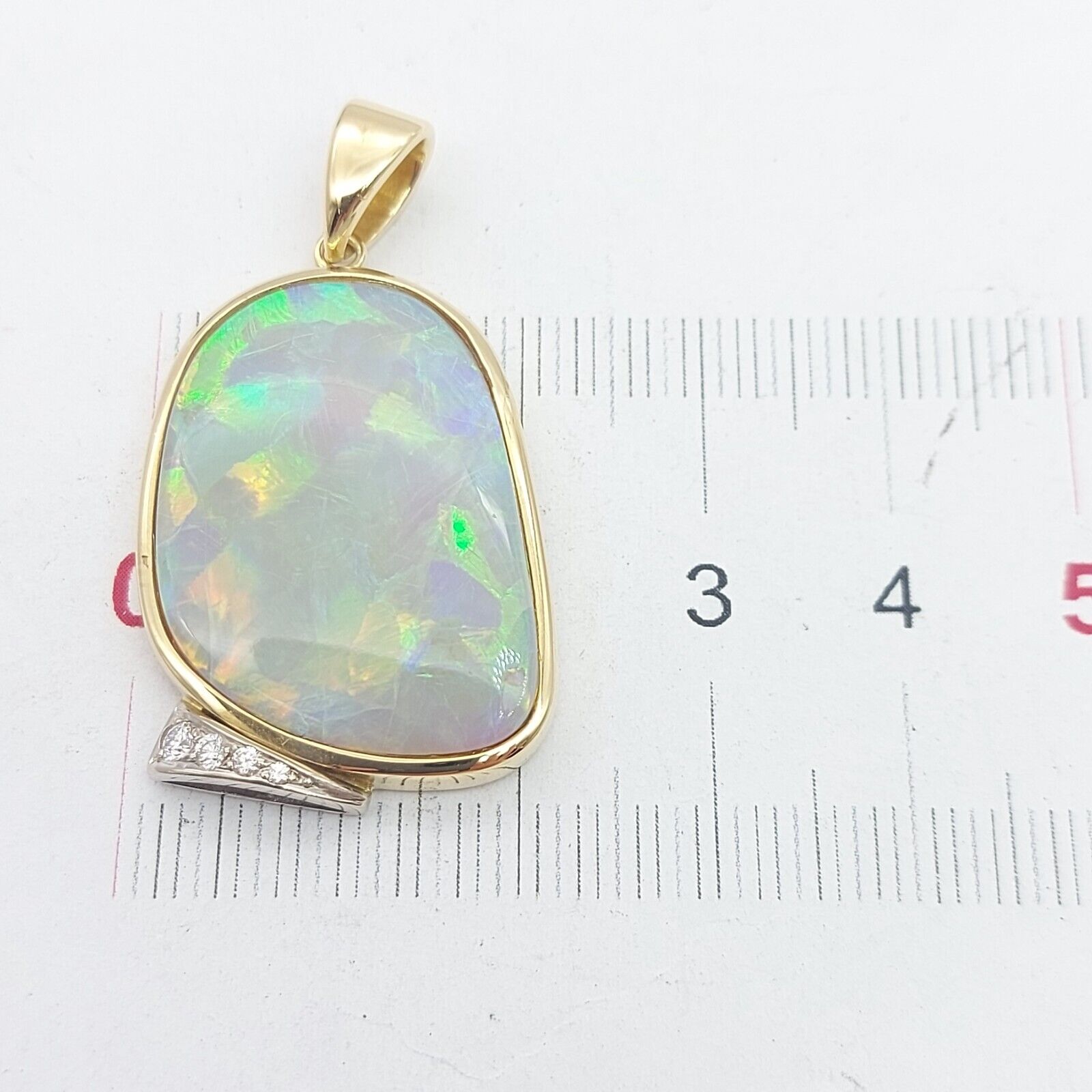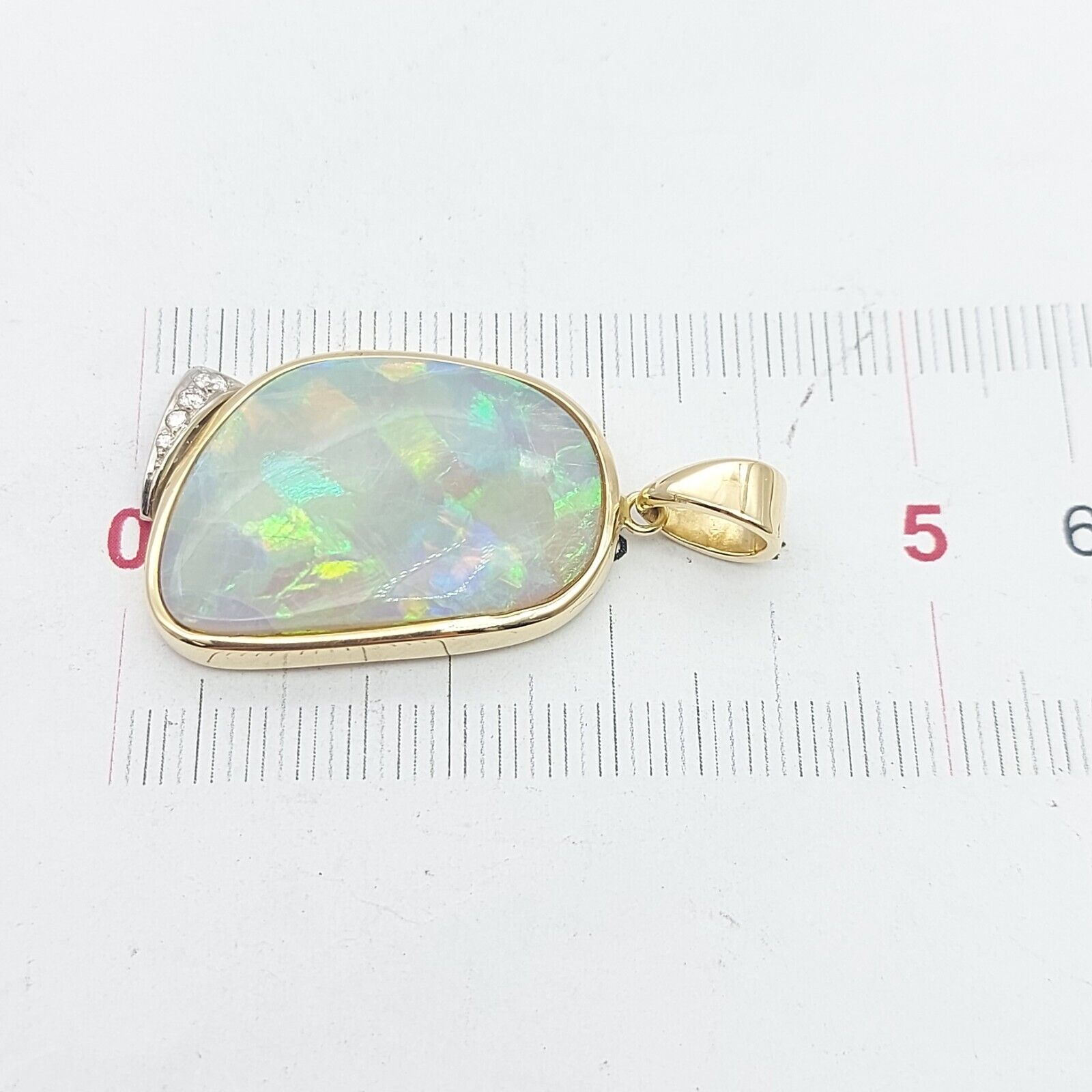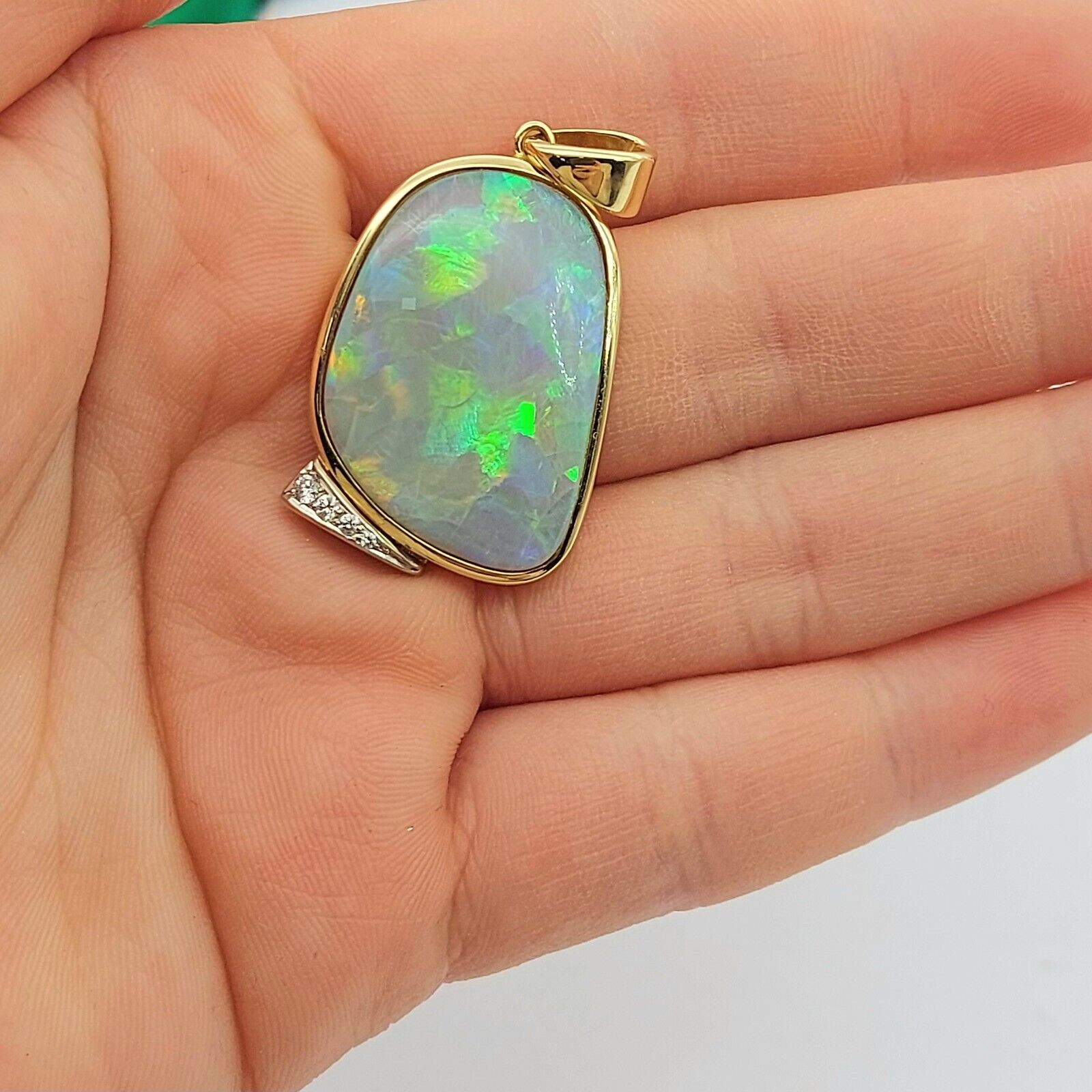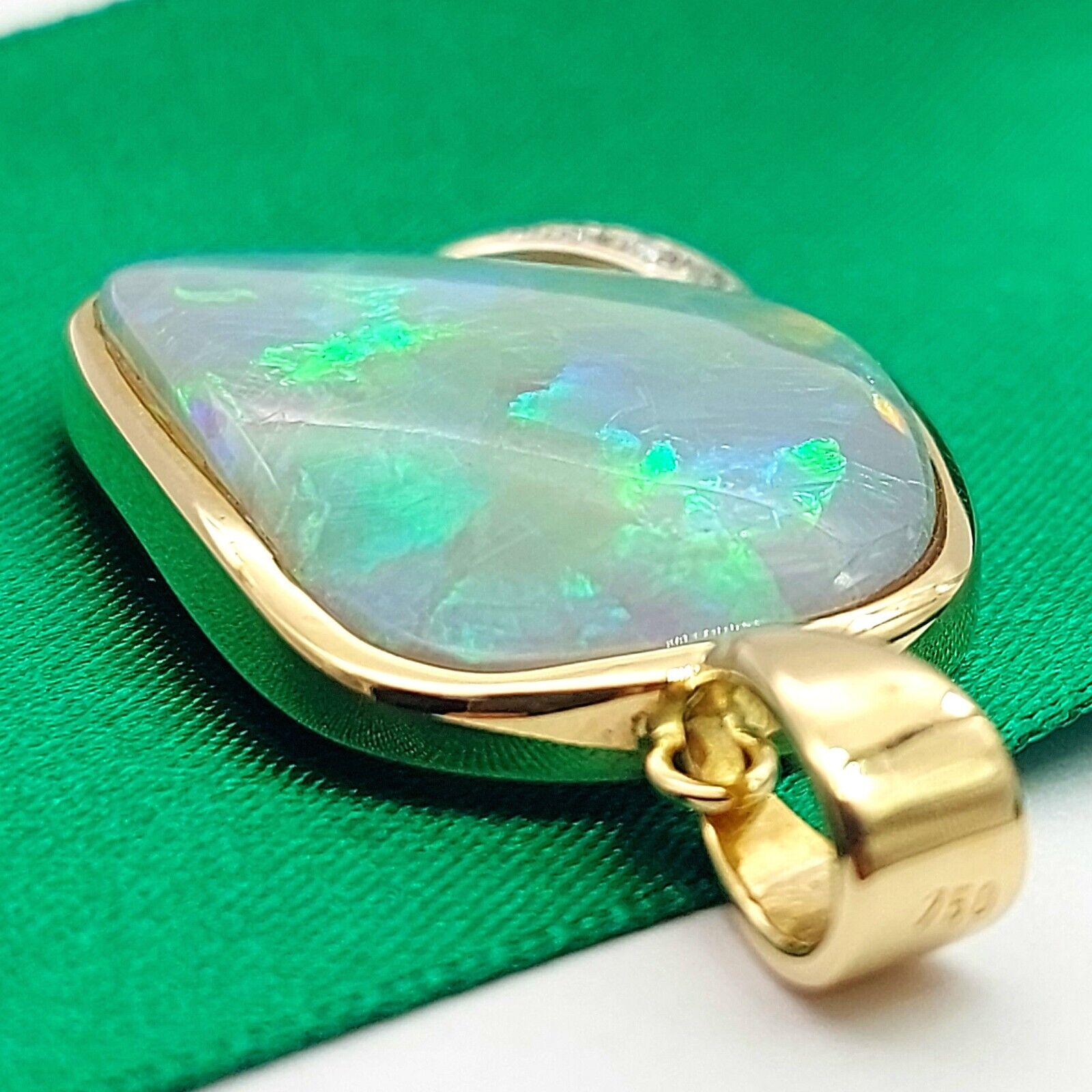 | Welcome to the Gold and Diamond Exchange Store! - Sydney Based Store that has experience in the jewellery industry for over 30 years. - Specialising in: selling and buying jewellery, precious metals, coins, bullion, diamonds and watches. - Professionally assessed and tested using the most up to date equipment in our industry, including x-ray testing & diamond testers to ensure the quality and purity of our products. - Most of our items are brand new, from defunct jewellery stores. We offer wholesale and below pricing. Ladies Yellow Gold 18ct (750,18K) High Quality Natural Opal Pendant W/ Val- 14k This piece has been professionally polished and cleaned to look and function as new and is in immaculate condition. A very rare and well-made good condition. This pendant is hallmarked '750' indicting the purity of the gold. Pendant for sale only, chain not included! *Includes Valuation Certificate*