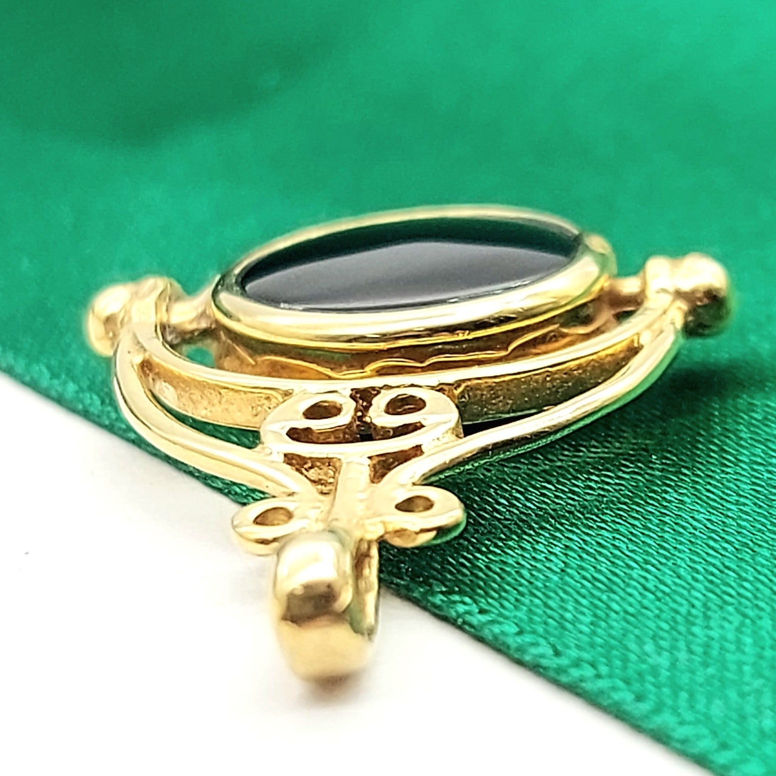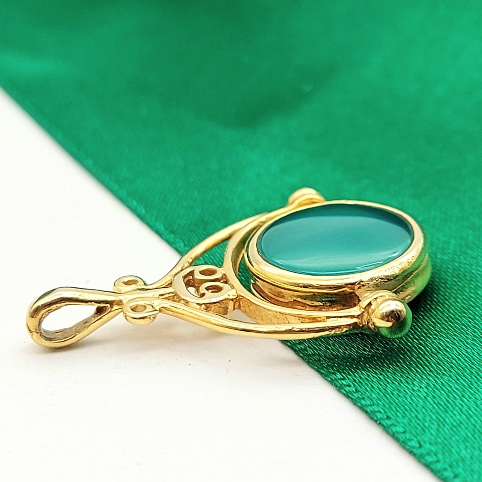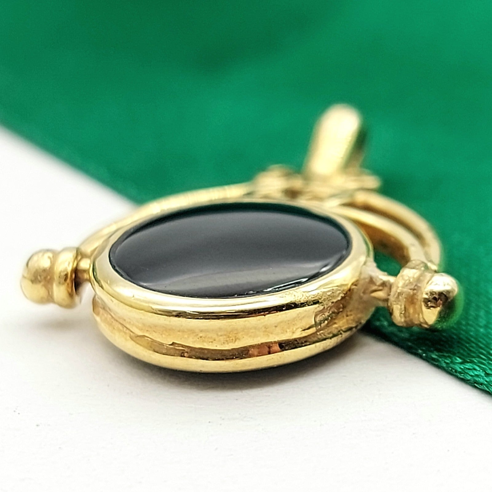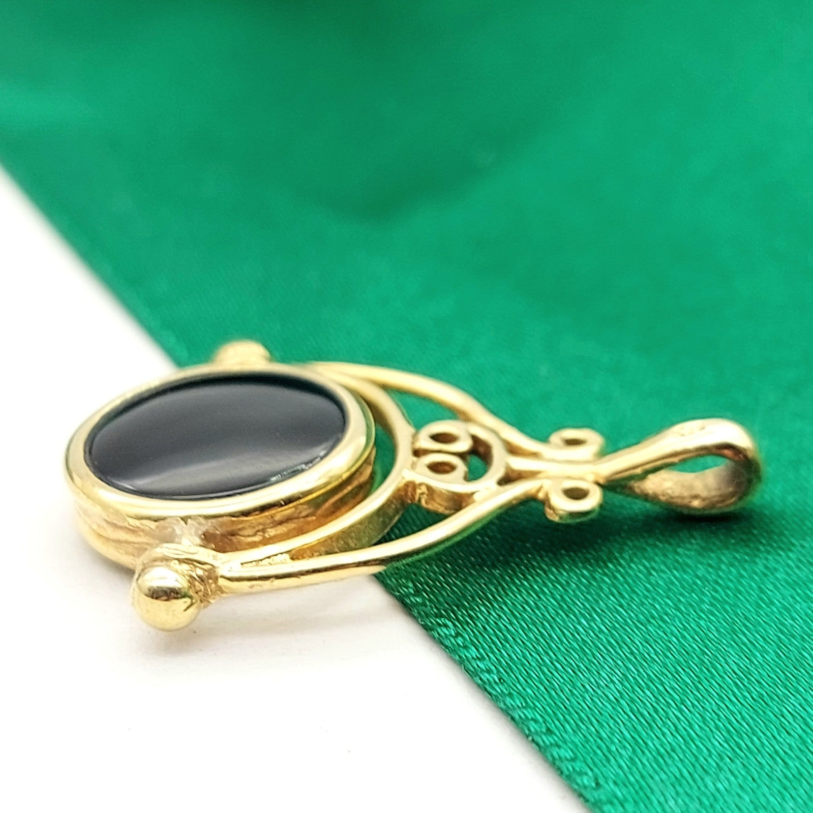 Welcome to the Gold and Diamond Exchange Store! - Sydney Based Store that has experience in the jewellery industry for over 30 years. - Specialising in: selling and buying jewellery, precious metals, coins, bullion, diamonds and watches. - Professionally assessed and tested using the most up to date equipment in our industry, including x-ray testing & diamond testers to ensure the quality and purity of our products. - Most of our items are brand new, from defunct jewellery stores. We offer wholesale and below pricing. Ladies Yellow Gold 9ct (375,9K) Green Agate & Onyx Arch Swivel Pendant This piece has been professionally polished and cleaned to look and function as new and is in immaculate condition. A very rare and well-made good condition. This pendant is hallmarked '375' indicting the purity of the gold. Pendant for sale only, chain not included!